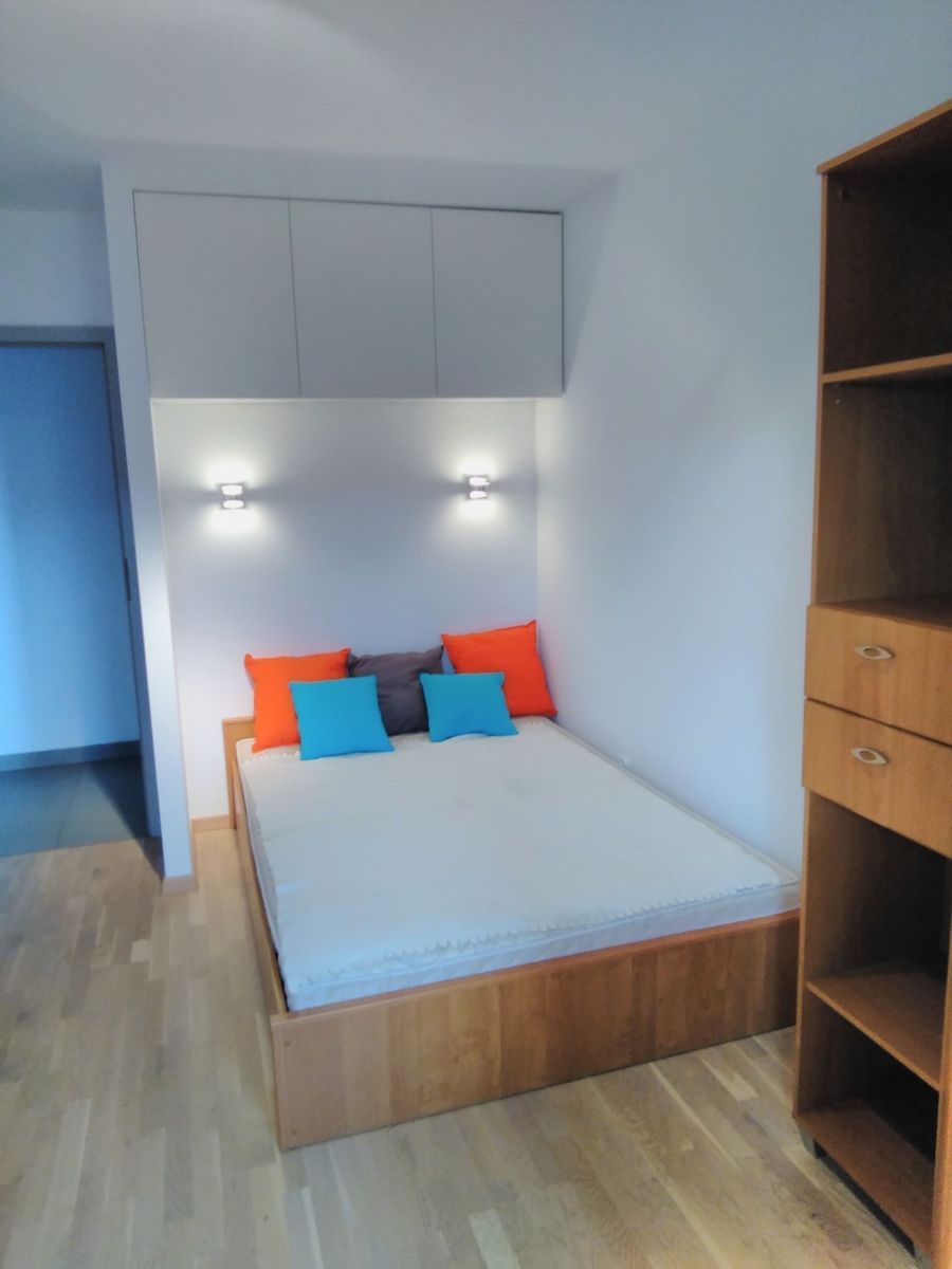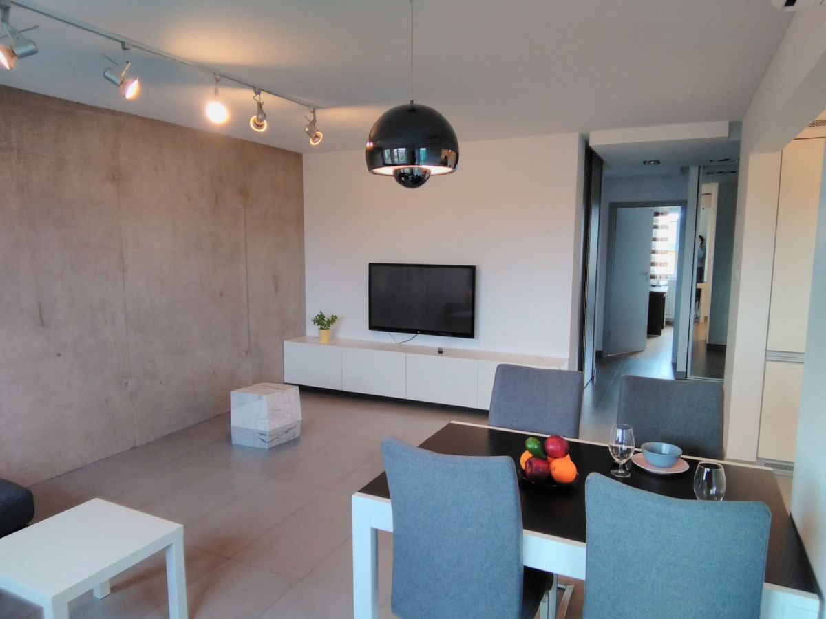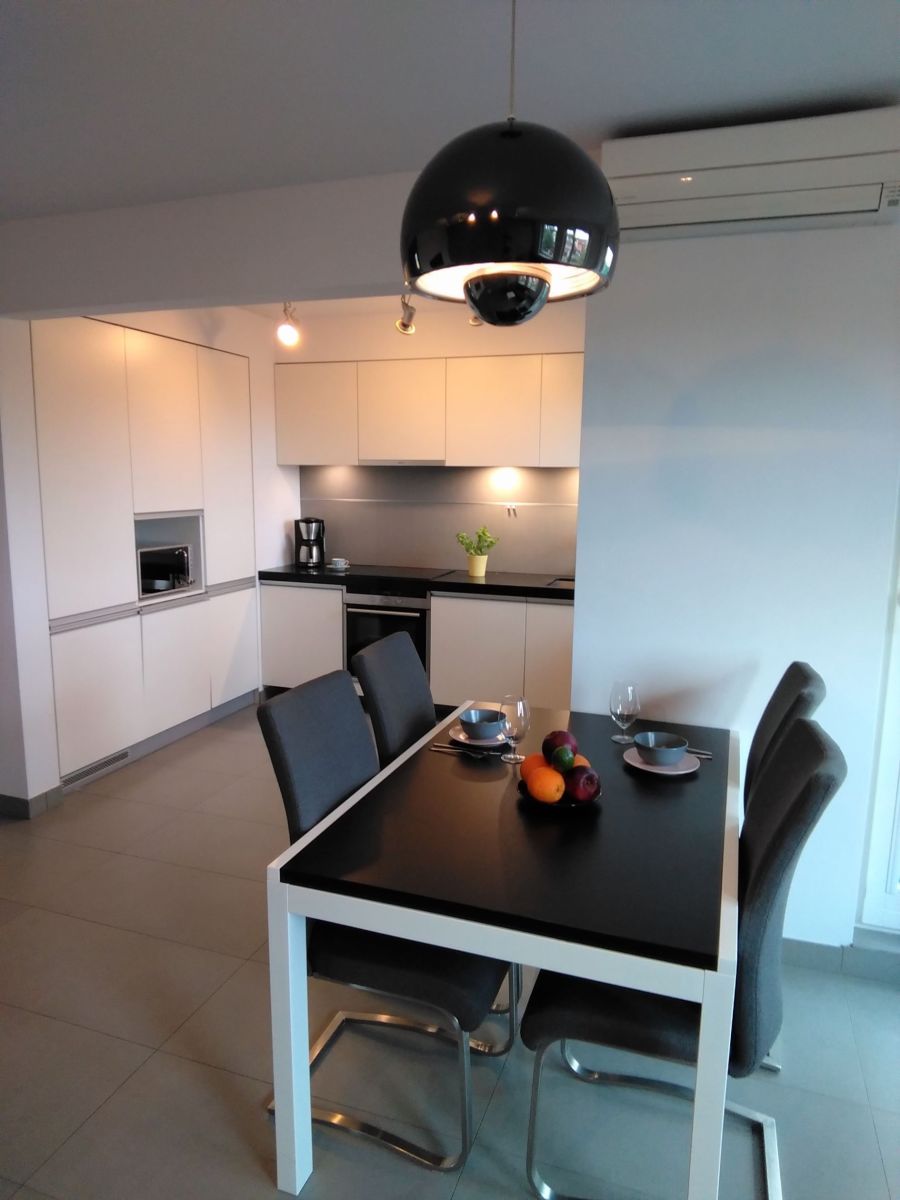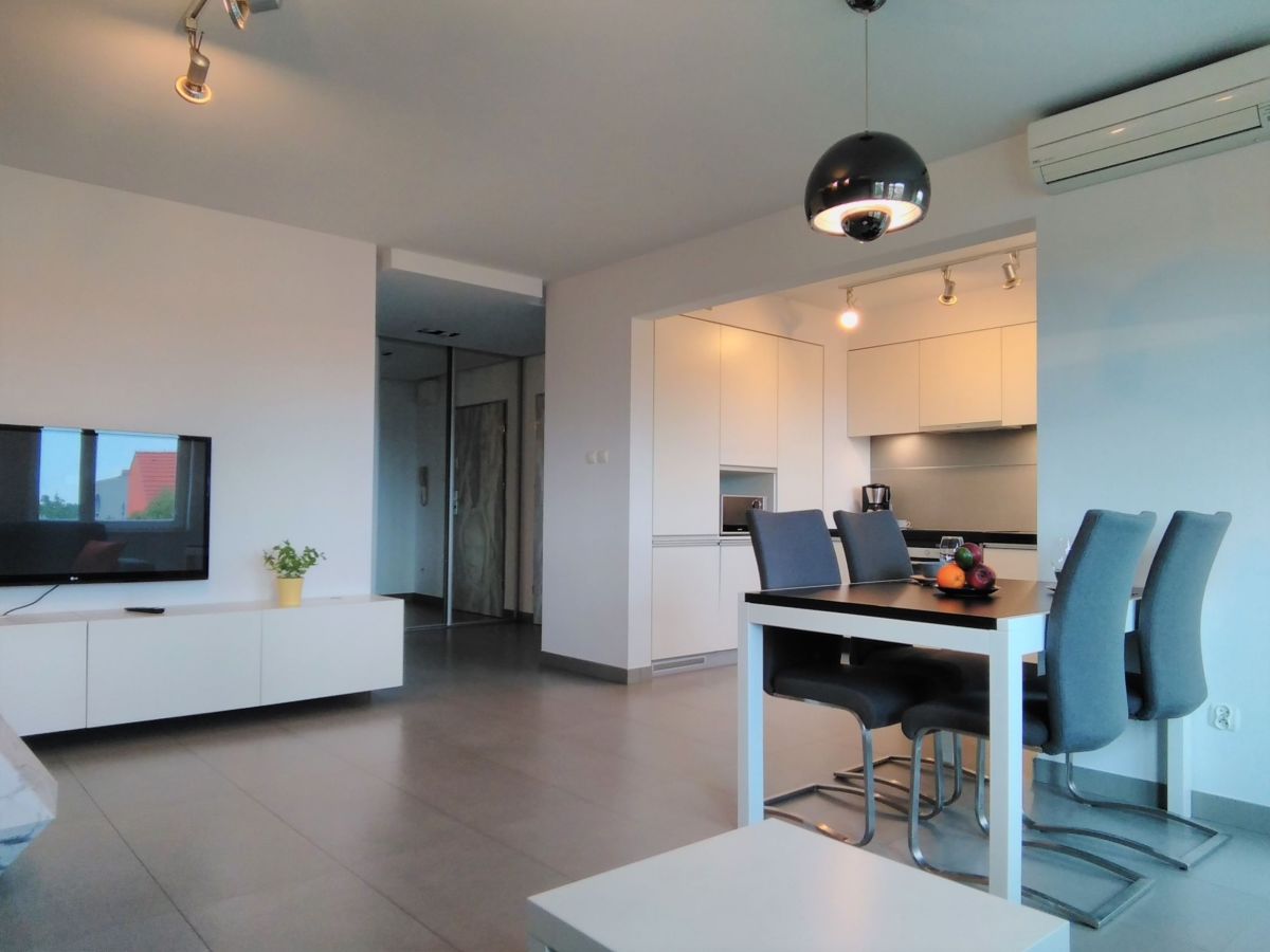 Mieszkanie jest w pełni umeblowane i wyposażone, kuchnia z zabudową oraz kompletnym sprzętem AGD. Salon z dużą narożną sofą gwarantuje komfortowy odpoczynek. Na podłogach w pokoju dziennym naturalny kamień, całość utrzymana w jasnych, naturalnych kolorach, które nadają wnętrzu przytulny i elegancki charakter.