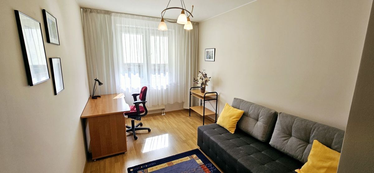 Mieszkanie jest w pełni umeblowane i wyposażone, gotowe do wprowadzenia się od zaraz. Południowa ekspozycja okien gwarantuje mnóstwo naturalnego światła, dzięki czemu wnętrza są słoneczne, jasne i ciche, z widokiem na spokojną przestrzeń pomiędzy budynkami.