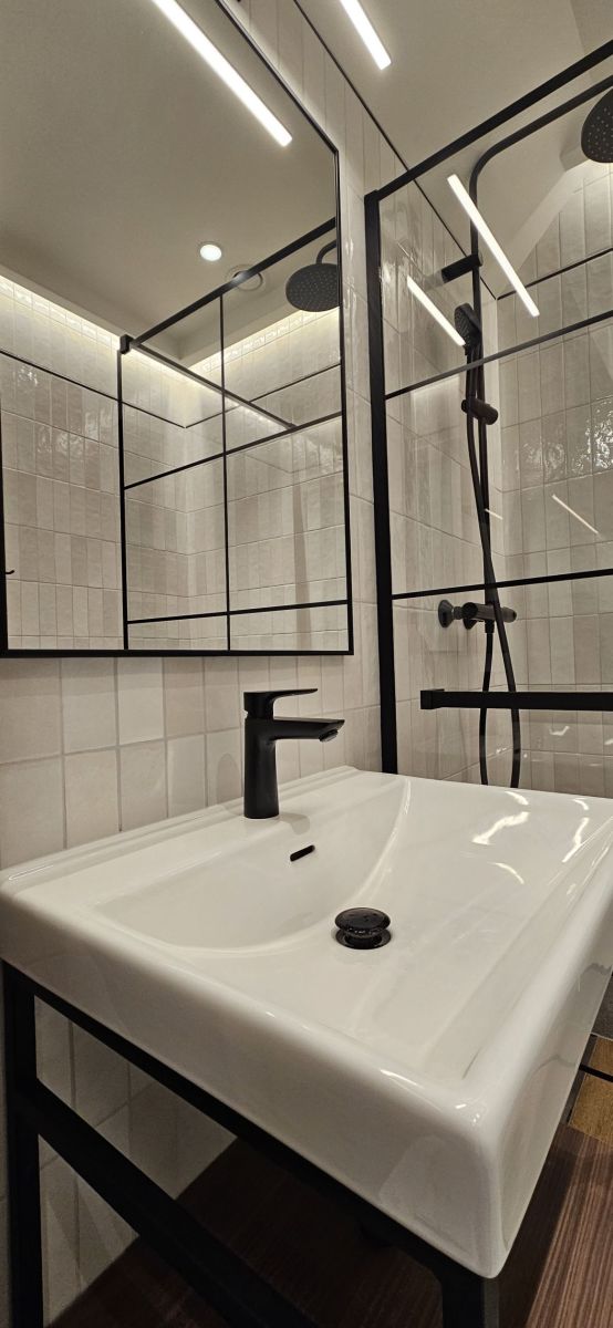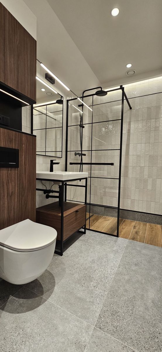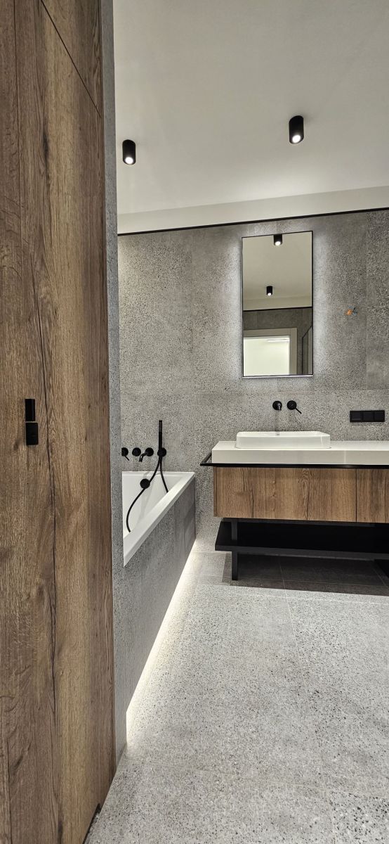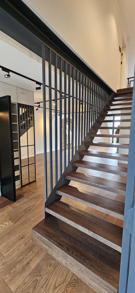 Apartament z niezależnym wejściem został starannie zaprojektowany, aby łączyć funkcjonalność z niepowtarzalnym stylem. Przestrzeń została podzielona na dwa poziomy, tworząc komfortową strefę dzienną i prywatną oazę spokoju.