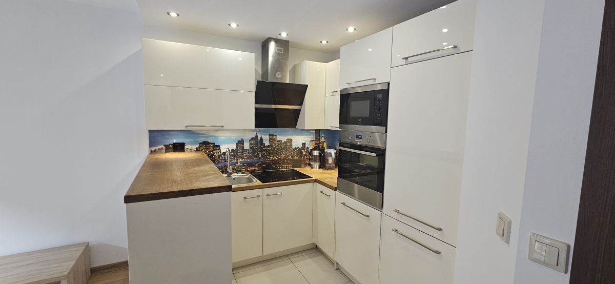 Kuchnia w zabudowie wraz ze sprzętem AGD ( zmywarka, lodówka, mikrofalówka, piekarnik, okap). Garderoba - zabudowa szafek i półek.