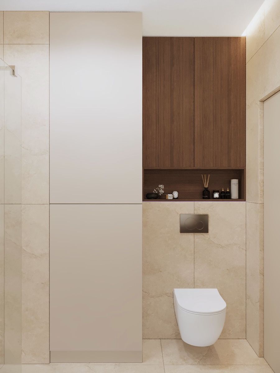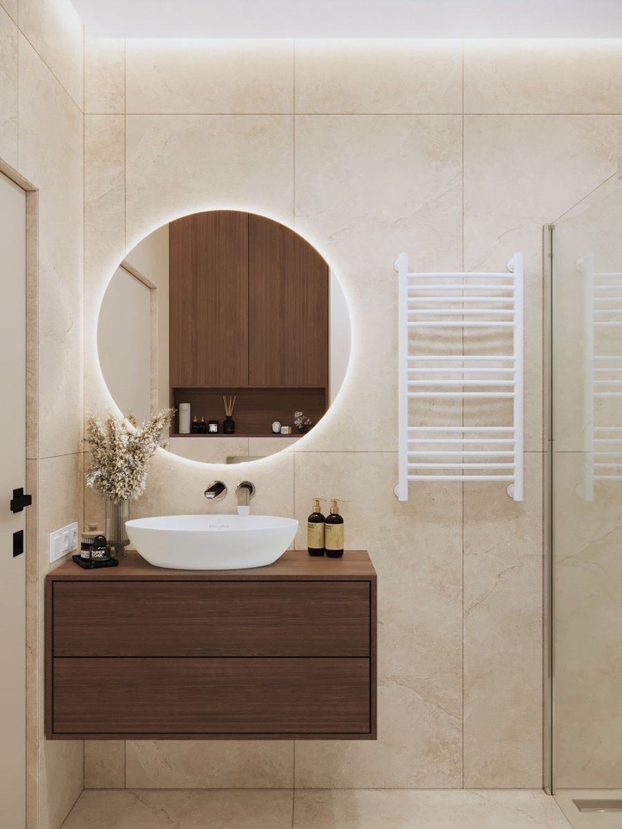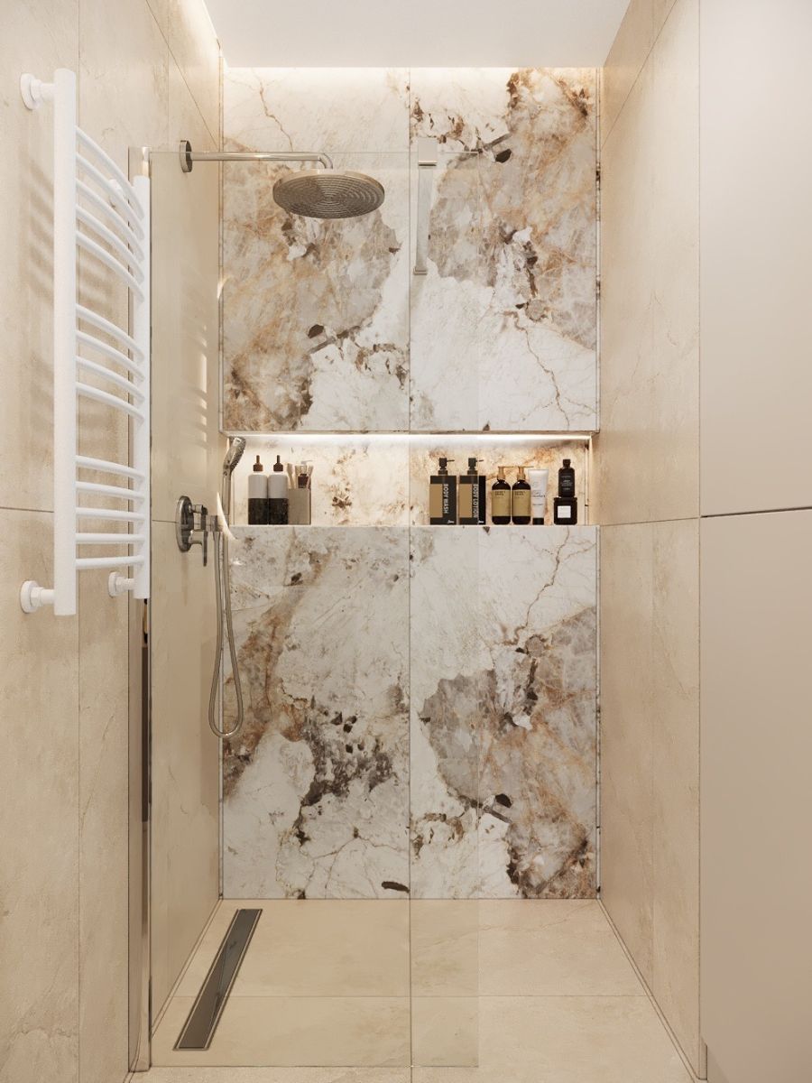 - Elegancką łazienkę z dużym prysznicem, wykończoną wysokiej jakości materiałami i gustownymi detalami