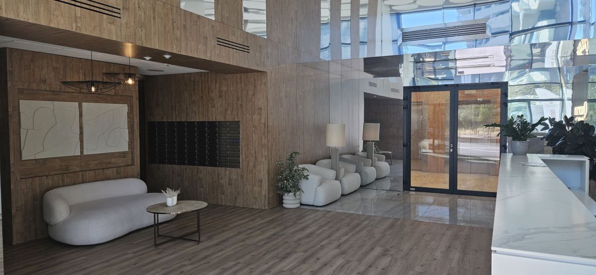 Budynek wyróżnia się nowoczesnym designem utrzymanym w jasnej kolorystyce, uzupełnionym dużą ilością zieleni i szklanych powierzchni, co tworzy harmonijną i przyjazną przestrzeń. Dla zapewnienia bezpieczeństwa mieszkańcom, dostępna jest recepcja oraz całodobowa ochrona fizyczna, gwarantując spokój i komfort codziennego życia.