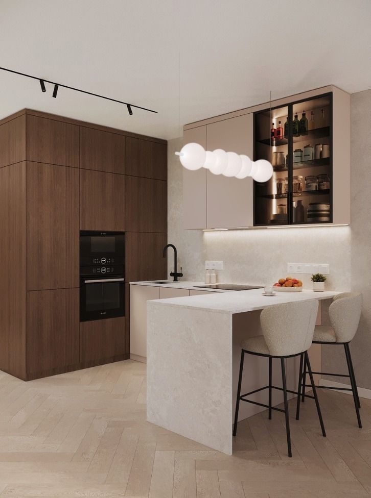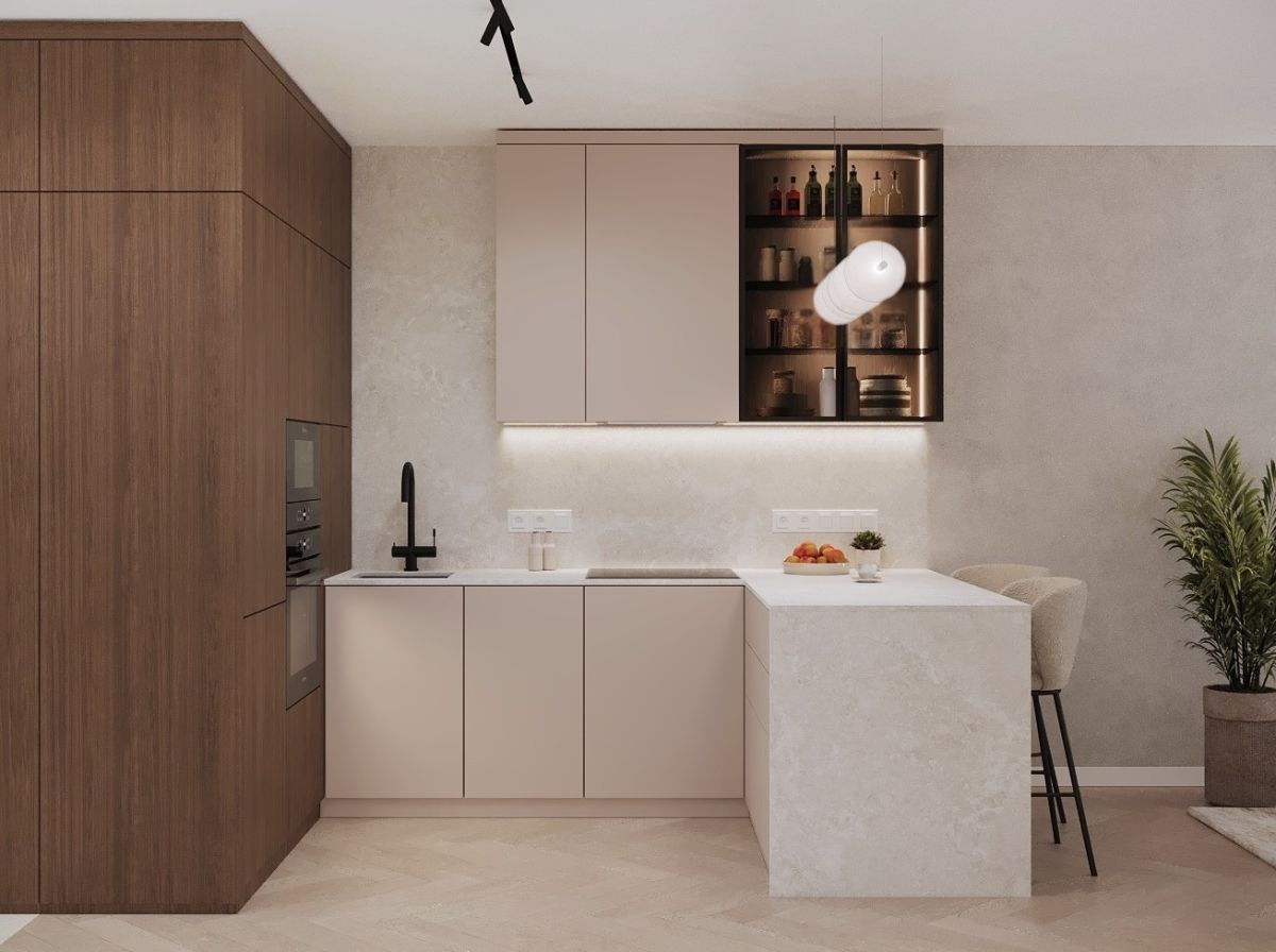- Stylową kuchnię w funkcjonalnej zabudowie, z wydzielonym miejscem na spożywanie posiłków